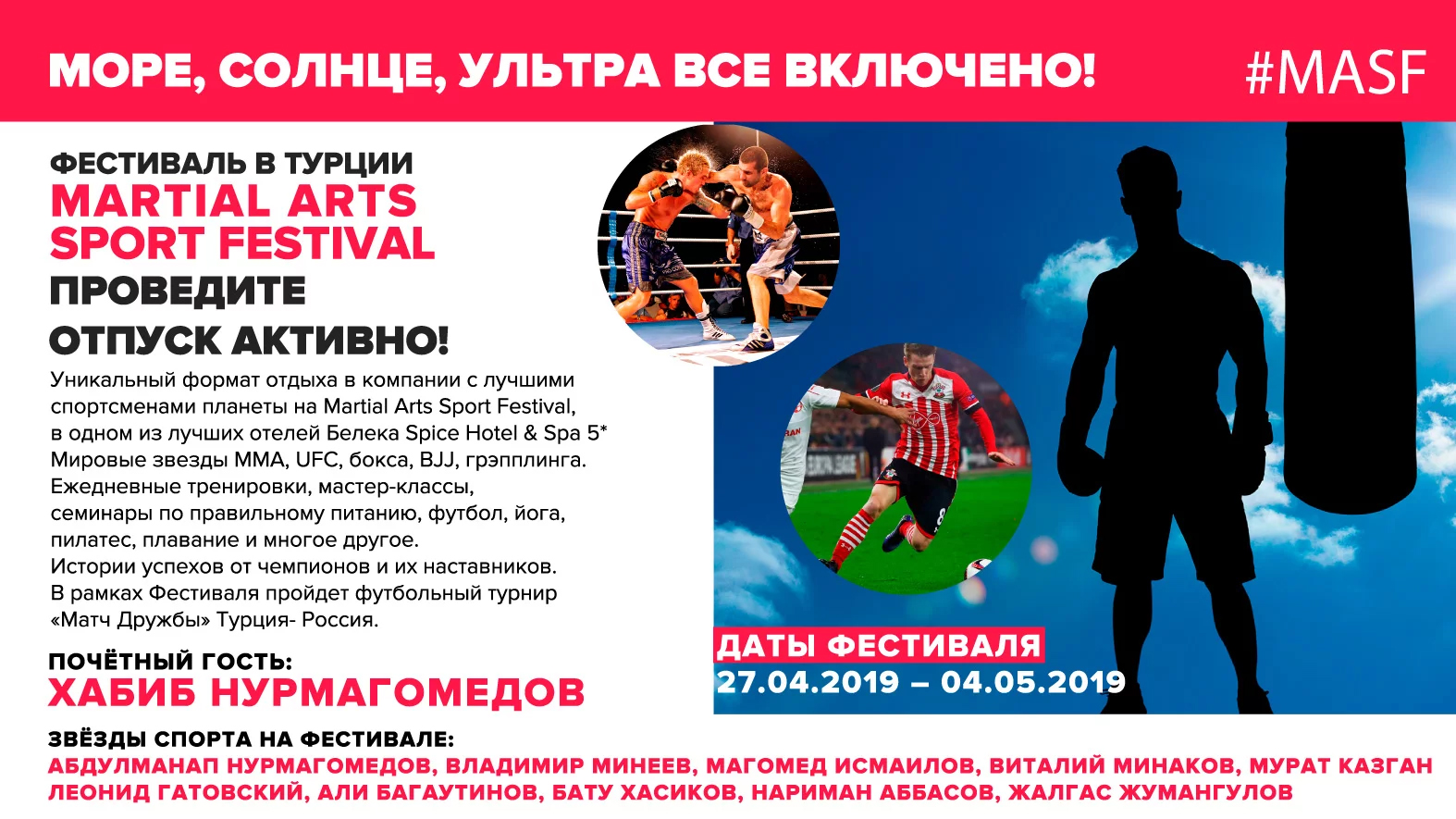 С 27 апреля по 4 мая в отеле Spice Hotel & Spa 5* пройдет Martial Arts Sport Festival 2019 - это спортивный семейный фестиваль с известными спортсменами и представителями шоу-бизнеса.